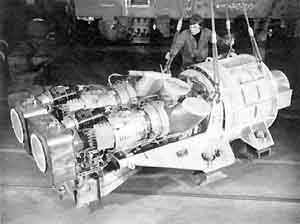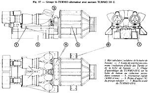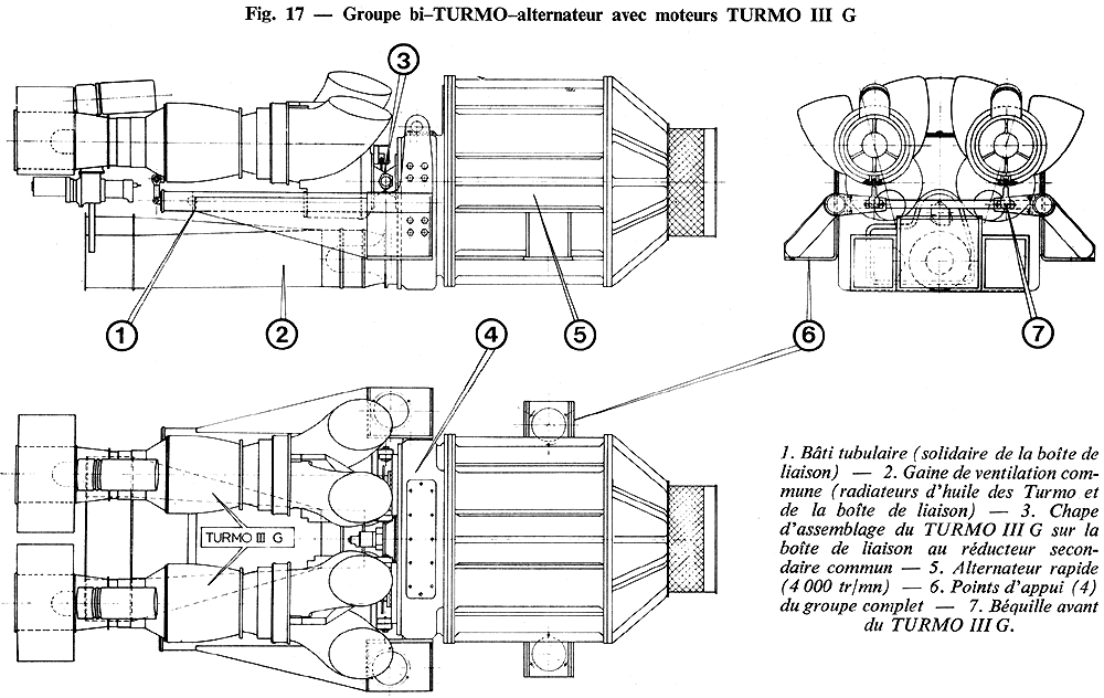 Le groupe électrogène est constitué essentiellement par deux turbomoteurs TURMO III G, en première étape, qui seront ensuite remplacés par des TURMO X, entraînant à vitesse constante, par l'intermédiaire d'un réducteur commun, un générateur électrique (fig. 17). Les deux turbomoteurs, disposés côte à côte, ont leur partie arrière articulée sur le réducteur et leur partie avant supportée, à l'aide d'une bielle permettant leur dilatation, par un châssis sur lequel est fixé le réducteur. L'ensemble compact ainsi constitué repose sur quatre plots élastiques: deux étant fixés à l'alternateur de traction, deux au châssis support des turbomoteurs (fig. 18). La présence d'une roue libre sur chacun des deux arbres d'entrée du réducteur commun permet le fonctionnement avec un ou deux turbomoteurs en service. Caractéristiques principales du groupe :