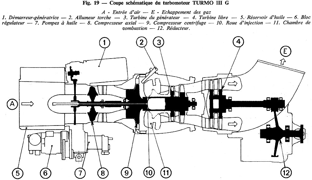 Le TURMO X comporte un étage supplémentaire en ce qui concerne le compresseur . La puissance utilisable, délivrée par le générateur de gaz, dépend de sa vitesse de rotation. Celle-ci est fonction du débit de combustible contrôlé lui-même par les organes de régulation du groupe. La turbine libre fournit la puissance motrice par l'intermédiaire d'un réducteur, de rapport de réduction 0,28 environ, incorporé au turbomoteur. Une tuyère dirige les gaz sortant de la turbine libre vers le dispositif d'échappement de la motrice. Caractéristiques principales : pour les conditions standards de référence (15°C - 1 013 mbar) :