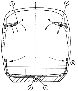 L'air du compartiment est évacué par les bouches placées sous le bandeau latéral de bas de face et reliées aux gaines aboutissant à la boîte d'évacuation dans le caisson sous caisse. L'air s'échappe ensuite à l'atmosphère par deux orifices calibrés placés à chaque extrémité du caisson.