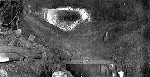 On aperçoit, ci-contre, une photo prise lors du creusement. Remarquez la galerie pilote par où furent évacués